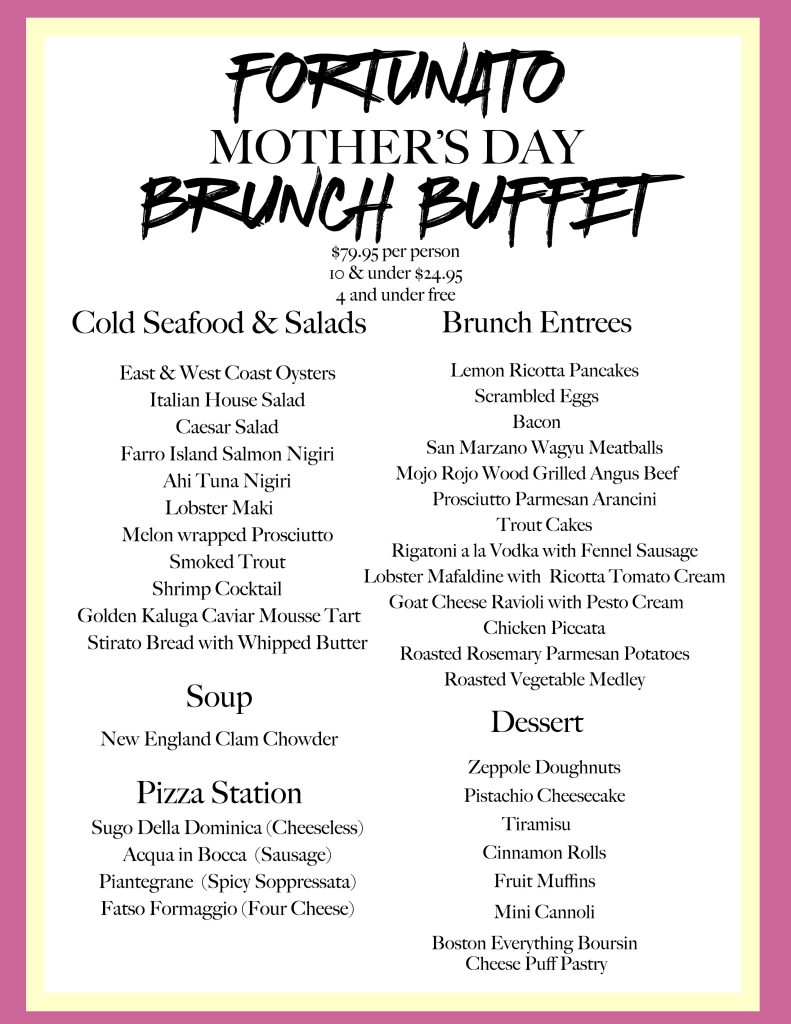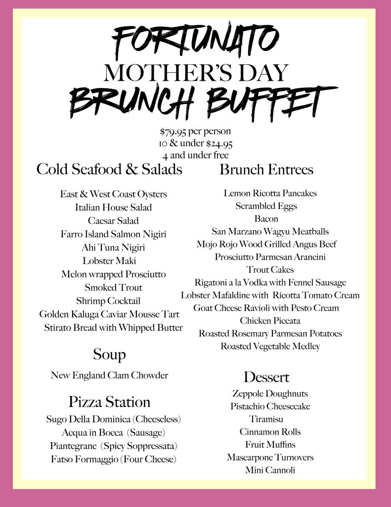Please advise, although Fortunato does allow guests under the age of 18, we do not offer a children’s menu, provide high chairs, booster seats or changing tables.